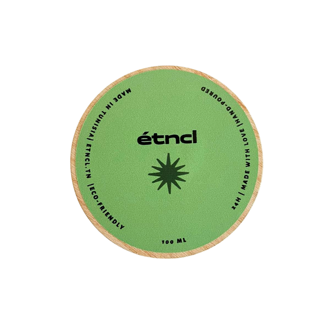 Fabriquée à la main en Tunisie, cette bougie est composée d’un mélange de cire de soja et de cire d’abeille naturelles, garantissant une combustion lente, homogène et respectueuse de l’environnement. Sa mèche en coton naturel (sans plomb) assure une flamme régulière et une diffusion optimale du parfum, sans fumée noire.